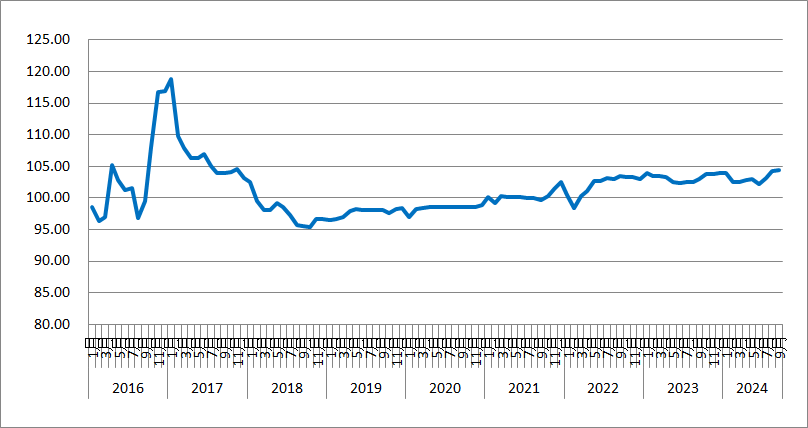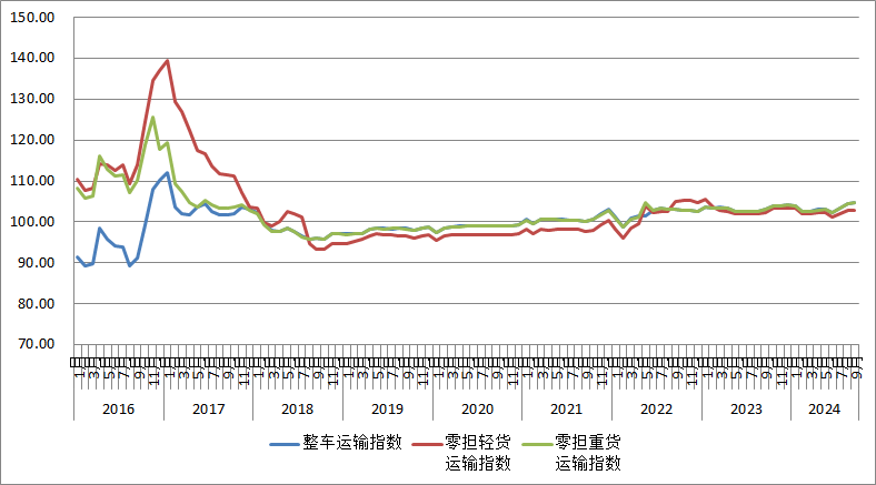 2024年9月份,由中國物流與采購聯合會和林安物流集團聯合調查的中國公路物流運價指數為104.4點,比上月回升0.17%,比去年同期回升1.44%。從周指數看,第一、二、三周運價指數環比回升,第四周運價指數環比回落。