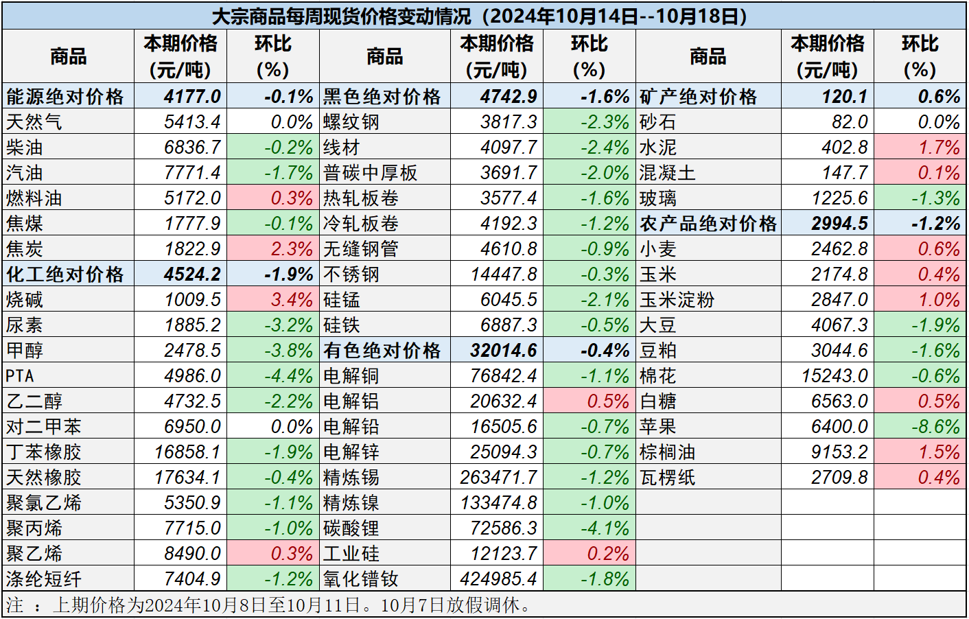 本表所示大宗商品價格(類別與產品規格說明見附表)為以人民幣計價的現貨價格(包含流通費用、利潤和稅費等)。計算這些價格時使用的信息來源,主要包括國內重點地區的生產商、貿易商及下游消費企業之間的成交、詢報盤及可成交價格。價格單位為人民幣元/噸。