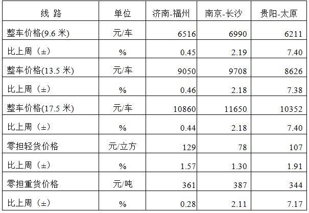 表1 本周部分線路平均價格及環(huán)比情況對比