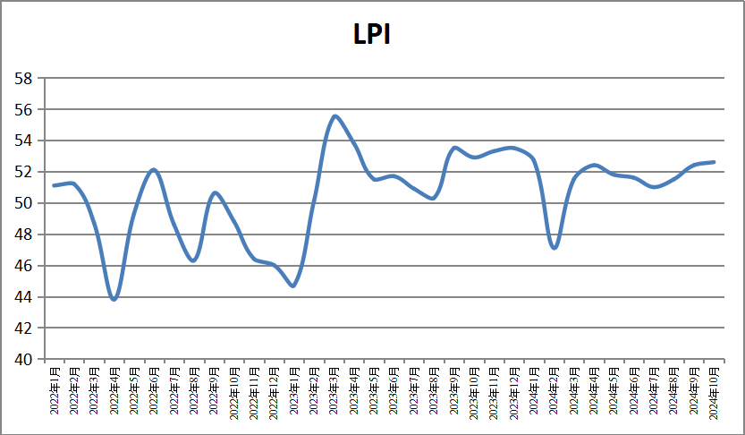 中國物流與采購聯合會發布的2024年10月份中國物流業景氣指數為52.6%,環比回升0.2個百分點。10月份,絕大部分分項指數環比回升,其中業務總量指數、新訂單指數、庫存周轉次數指數、資金周轉率指數、設備利用率指數、固定資產投資完成額指數和業務活動預期指數保持在景氣區間。