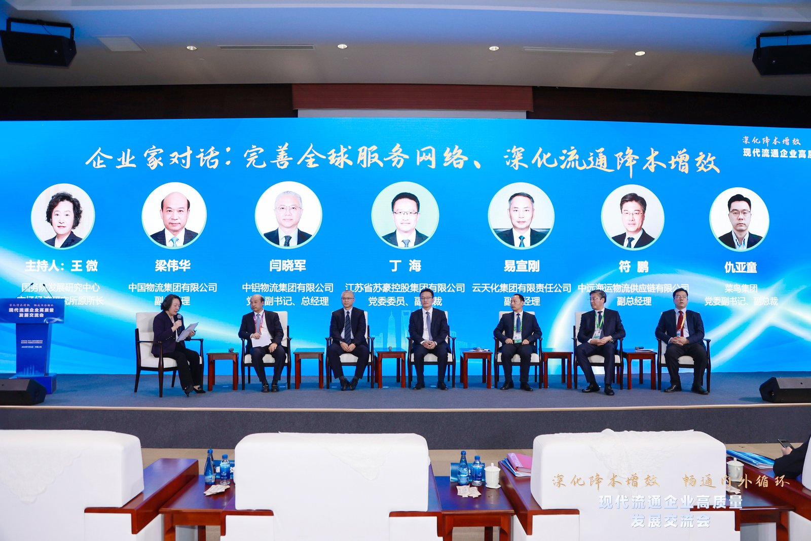 會議還進(jìn)行了專家把脈與企業(yè)家對話環(huán)節(jié),國務(wù)院發(fā)展研究中心市場經(jīng)濟(jì)研究所原所長、二級研究員王微主持對話。中國物流集團(tuán)有限公司副總經(jīng)理梁偉華,中鋁物流集團(tuán)有限公司黨委副書記、總經(jīng)理閆曉軍,江蘇省蘇豪控股集團(tuán)有限公司黨委委員、副總裁丁海,云天化集團(tuán)有限責(zé)任公司副總經(jīng)理易宣剛,中遠(yuǎn)海運(yùn)物流供應(yīng)鏈有限公司副總經(jīng)理符鵬,菜鳥集團(tuán)黨委副書記、副總裁仇亞童等參加了對話。
