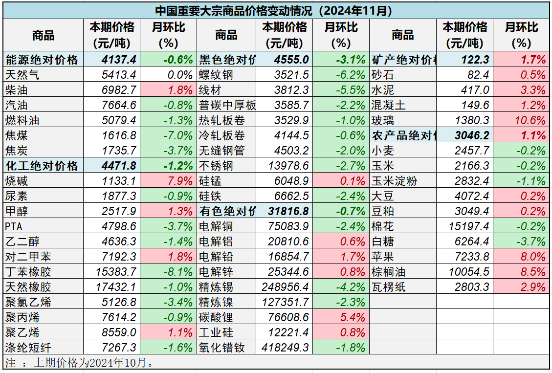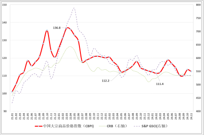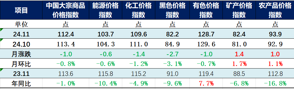 由中物聯大宗分會和上海鋼聯等單位聯合調查,中國物流與采購聯合會發(fā)布的2024年11月份中國大宗商品價格指數(CBPI)為112.4點,環(huán)比回落0.8%,同比下跌1%。從指數運行情況來看,受黑色金屬和有色金屬價格沖高回落影響,大宗商品價格指數出現小幅回調,隨一攬子增量政策效果的持續(xù)釋放,市場信心持續(xù)增強,生產活動逐步恢復,大宗市場總體保持穩(wěn)定。從國內外大宗商品指數走勢來看,全球經濟貿易不確定上升,疊加美元走強,令大宗商品價格承壓。此外,部分大宗商品價格指數持續(xù)低位運行,也表明有的行業(yè)市場需求仍然不足、內生動力仍有待增強,鞏固和增強經濟回升向好態(tài)勢,需進一步加快落實和協調推進一攬子增量政策,充分釋放市場消費潛力,激活市場需求。