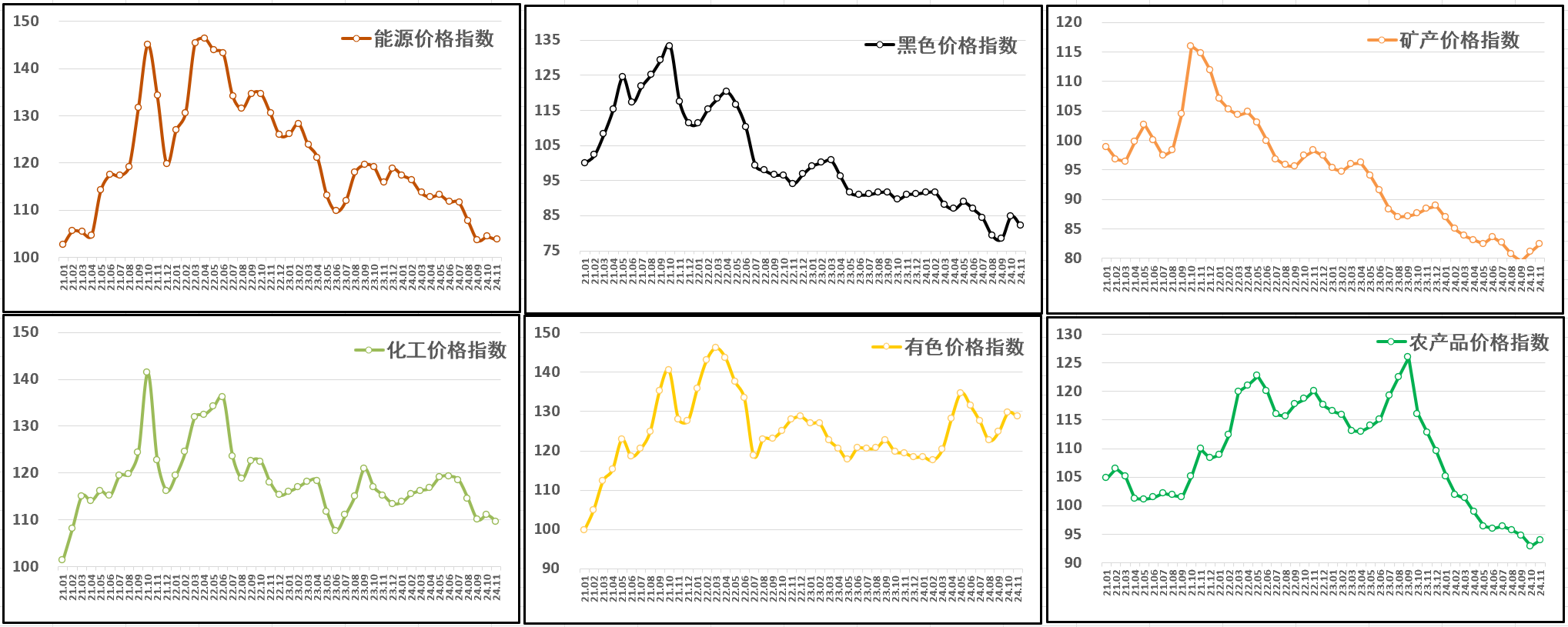 分行業(yè)看:礦產價格指數持續(xù)回升,報82.4點,月環(huán)比上漲1.7%,年同比下跌6.8%;農產品價格指數觸底反彈,報93.9點,月環(huán)比上漲1.1%,年同比下跌16.8%;能源價格指數震蕩走低,報103.7點,月環(huán)比下跌0.6%,年同比下跌10.4%;有色價格指數小幅回調,報128.7點,月環(huán)比下跌0.7%,年同比上漲7.7%;化工價格指數弱市下行,報109.6點,月環(huán)比下跌1.2%,年同比下跌4.9%;黑色價格指數沖高回落,報82.2點,月環(huán)比下跌3.1%,年同比下跌9.6%;。