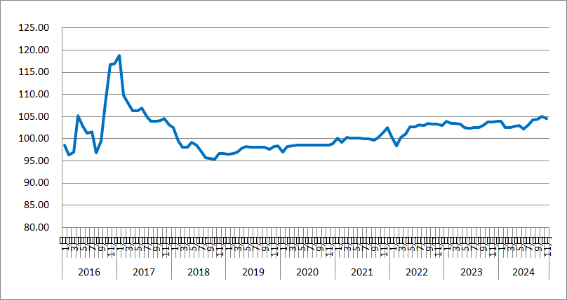 2024年11月份,由中國(guó)物流與采購(gòu)聯(lián)合會(huì)和林安物流集團(tuán)聯(lián)合調(diào)查的中國(guó)公路物流運(yùn)價(jià)指數(shù)為104.6點(diǎn),比上月回落0.48%,比去年同期回升0.75%。從周指數(shù)看,第二、三、五周運(yùn)價(jià)指數(shù)環(huán)比回落,第一、四周運(yùn)價(jià)指數(shù)環(huán)比回升。