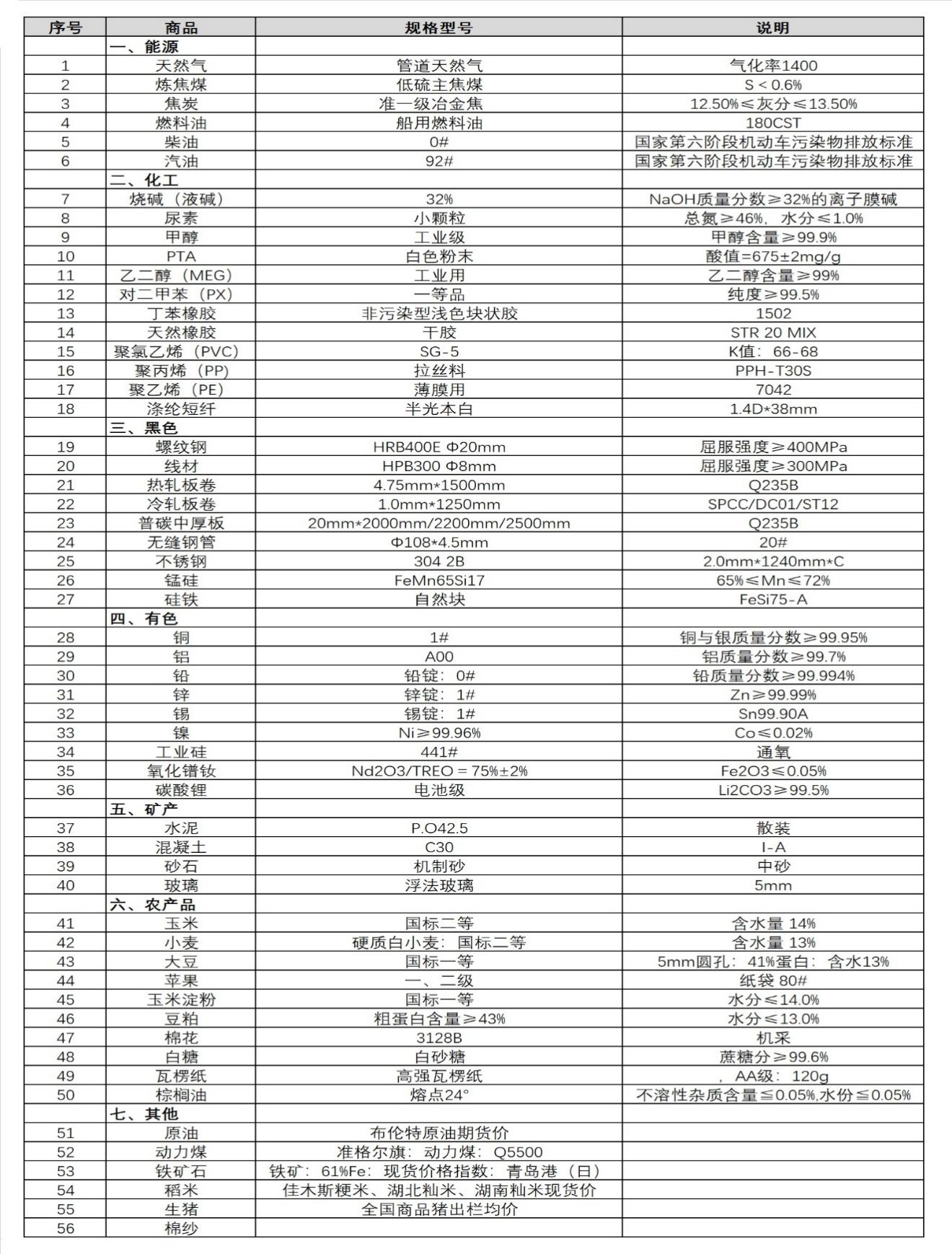 本表所示大宗商品價(jià)格(類別與產(chǎn)品規(guī)格說明見附表)為以人民幣計(jì)價(jià)的現(xiàn)貨價(jià)格(包含流通費(fèi)用、利潤和稅費(fèi)等)。計(jì)算這些價(jià)格時(shí)使用的信息來源,主要包括國內(nèi)重點(diǎn)地區(qū)的生產(chǎn)商、貿(mào)易商及下游消費(fèi)企業(yè)之間的成交、詢報(bào)盤及可成交價(jià)格。價(jià)格單位為人民幣元/噸。