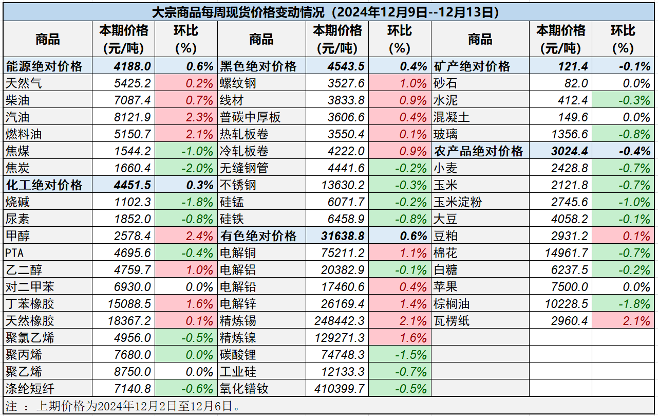 本表所示大宗商品價格(類別與產品規格說明見附表)為以人民幣計價的現貨價格(包含流通費用、利潤和稅費等)。計算這些價格時使用的信息來源,主要包括國內重點地區的生產商、貿易商及下游消費企業之間的成交、詢報盤及可成交價格。價格單位為人民幣元/噸。