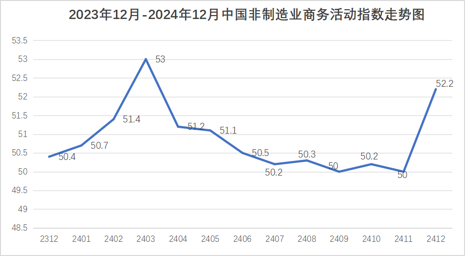 中國物流與采購聯合會、國家統計局服務業調查中心發布的2024年12月份中國非制造業商務活動指數為52.2%,環比上升2.2個百分點。由于非制造業沒有綜合指數,通常以商務活動指數來反映非制造業經濟的總體變化。