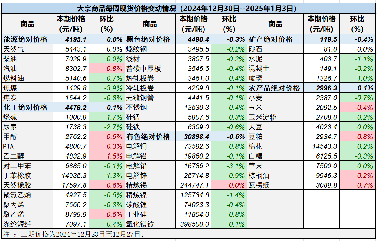 據中國物流與采購聯合會對全國50種重要大宗商品市場價格調查顯示,本期價格(2024年12月30日至2025年1月3日)與上期價格相比,37種(占比74%)大宗商品價格下跌,11種(占比22%)價格上漲,2種(占比4%)價格持平。