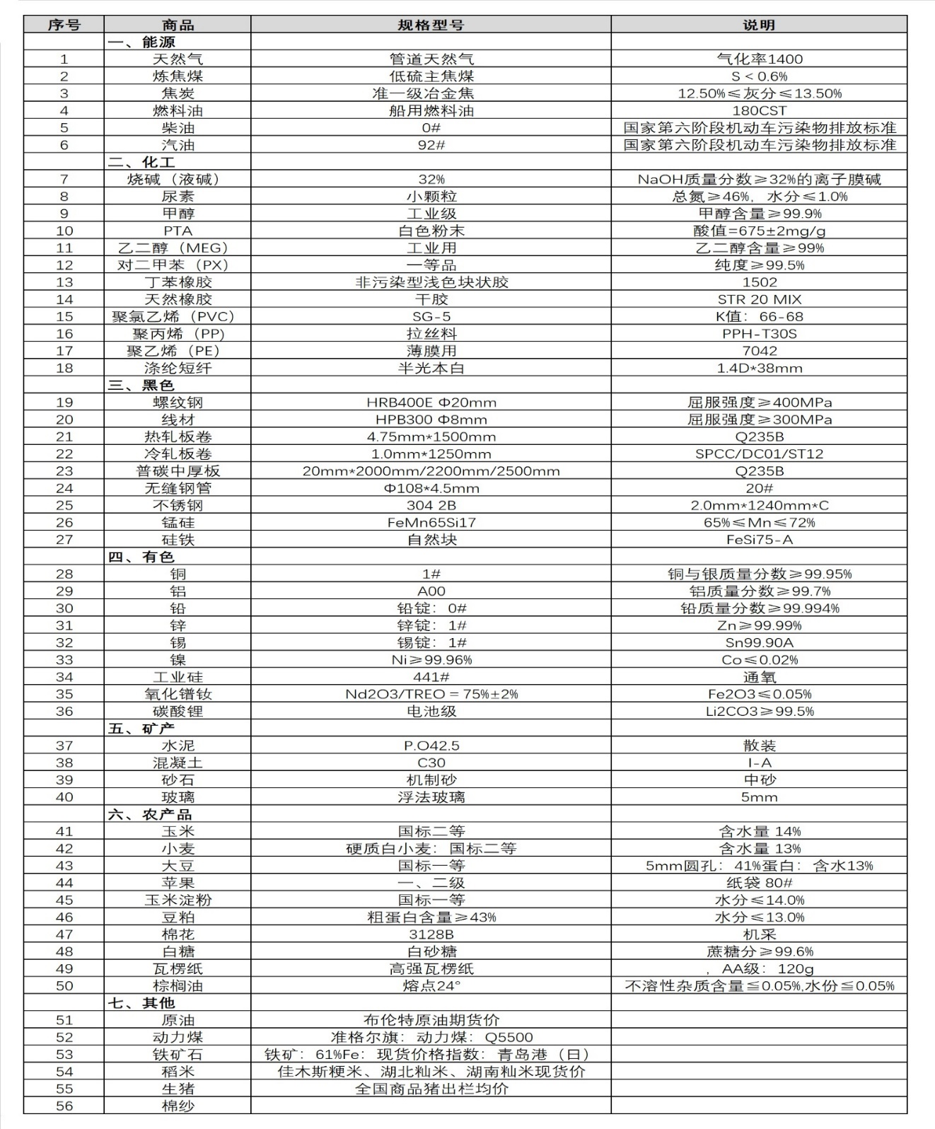 本表所示大宗商品價格(類別與產品規格說明見附表)為以人民幣計價的現貨價格(包含流通費用、利潤和稅費等)。計算這些價格時使用的信息來源,主要包括國內重點地區的生產商、貿易商及下游消費企業之間的成交、詢報盤及可成交價格。價格單位為人民幣元/噸。