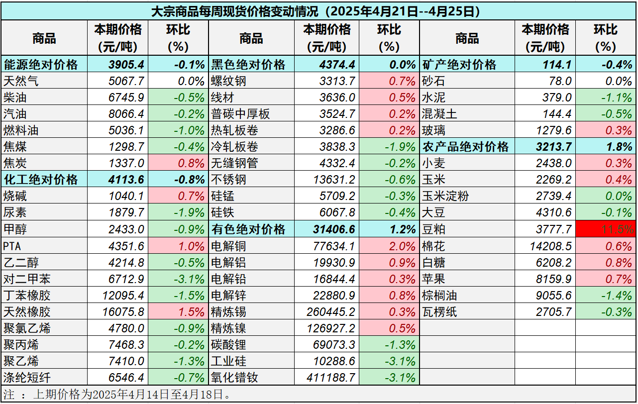 據中國物流與采購聯合會對全國50種重要大宗商品市場價格調查顯示,本期價格(2025年4月21日至4月25日)與上期價格相比,27種(占比54%)大宗商品價格下跌,21種(占比42%)價格上漲, 2種(占比4%)價格持平。