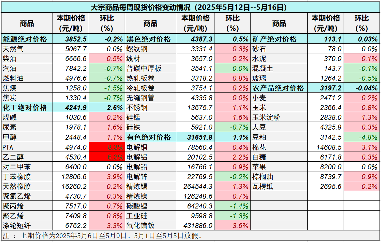 據(jù)中國物流與采購聯(lián)合會對全國50種重要大宗商品市場價格調(diào)查顯示,本期價格(2025年5月12日至5月16日)與上期價格相比,34種(占比68%)價格上漲,12種(占比24%)大宗商品價格下跌,4種(占比8%)價格持平。