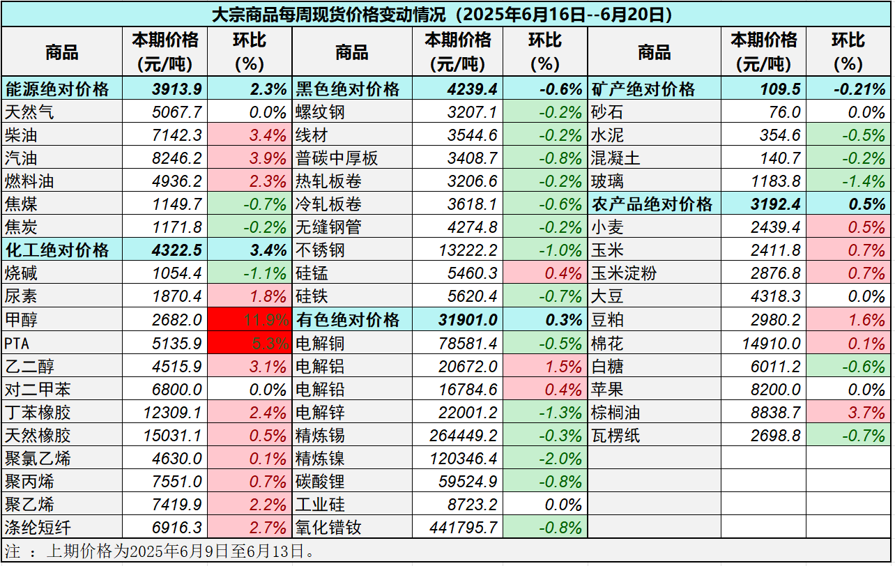 據中國物流與采購聯合會對全國50種重要大宗商品市場價格調查顯示,本期價格(2025年6月16日至6月20日)與上期價格相比,22種(占比44%)價格上漲,22種(占比44%)大宗商品價格下跌,6種(占比12%)價格持平。