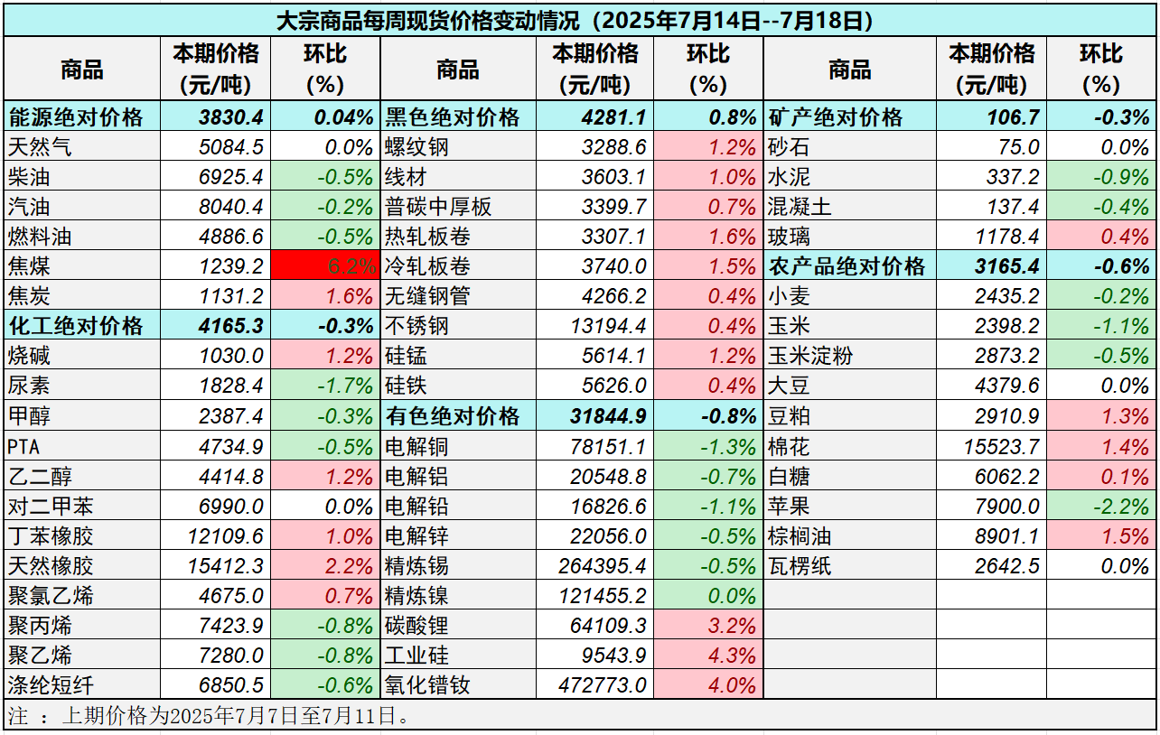 本表所示大宗商品價格(類別與產品規格說明見附表)為以人民幣計價的現貨價格(包含流通費用、利潤和稅費等)。計算這些價格時使用的信息來源,主要包括國內重點地區的生產商、貿易商及下游消費企業之間的成交、詢報盤及可成交價格。價格單位為人民幣元/噸。