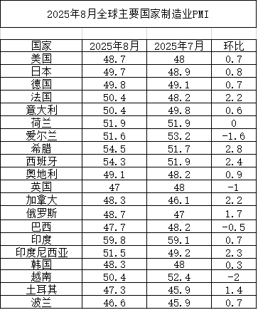 2025年8月全球主要國家制造業(yè)PMI