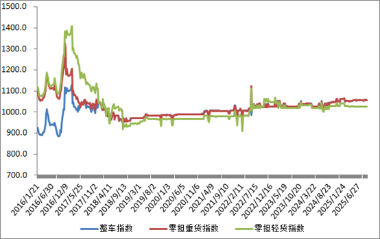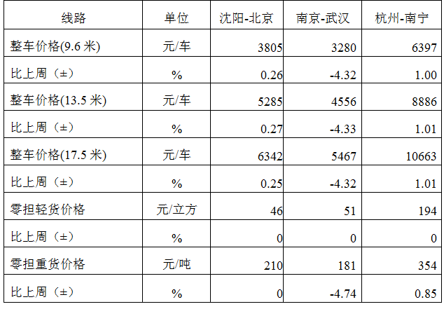 分車型看,各車型指數環比漲跌互現。其中,整車指數為1057.16點,比上周回升0.02%;零擔輕貨指數為1025.99點,比上周回升0.03%;零擔重貨指數為1056.91點,比上周回落0.18%。