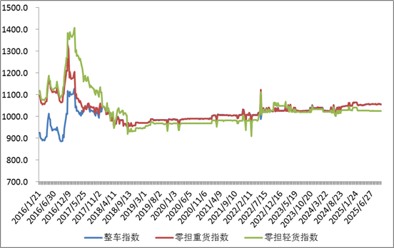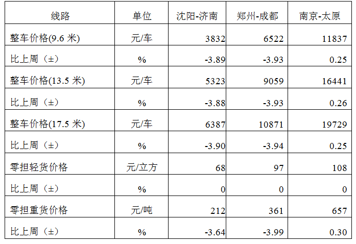 分車(chē)型看,各車(chē)型指數(shù)環(huán)比有所回落。其中,整車(chē)指數(shù)為1054.92點(diǎn),比上周回落0.09%;零擔(dān)輕貨指數(shù)為1026.20點(diǎn),比上周回升0.02%;零擔(dān)重貨指數(shù)為1054.63點(diǎn),比上周回落0.09%。