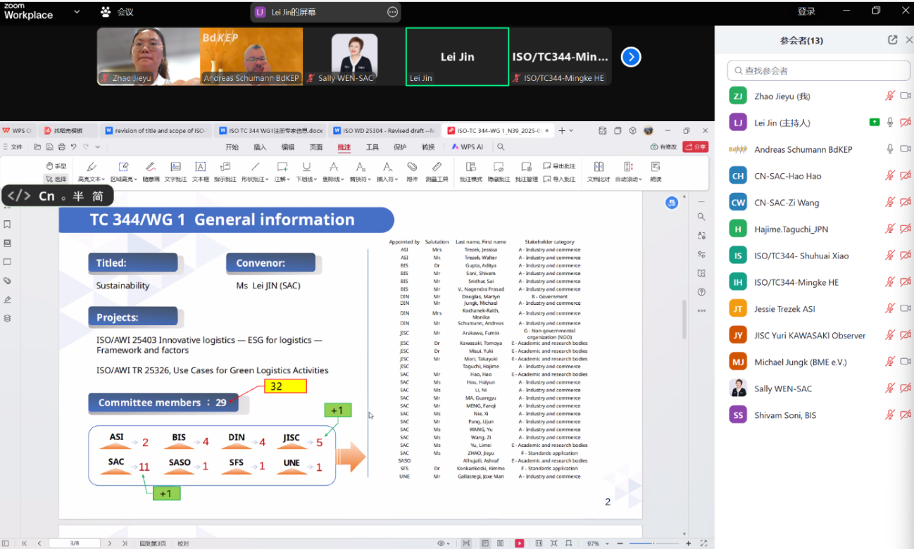 本次會議重點討論了由中國提案的國際標準項目ISO/WD 25403“創新物流—物流ESG—框架與要素(Innovative logistics - ESG for logistics - Framework and factors)”的技術內容及后續工作計劃,并決定將于2025年11月6日召開ISO/TC 344/WG1第五次會議進一步開展工作組內討論。