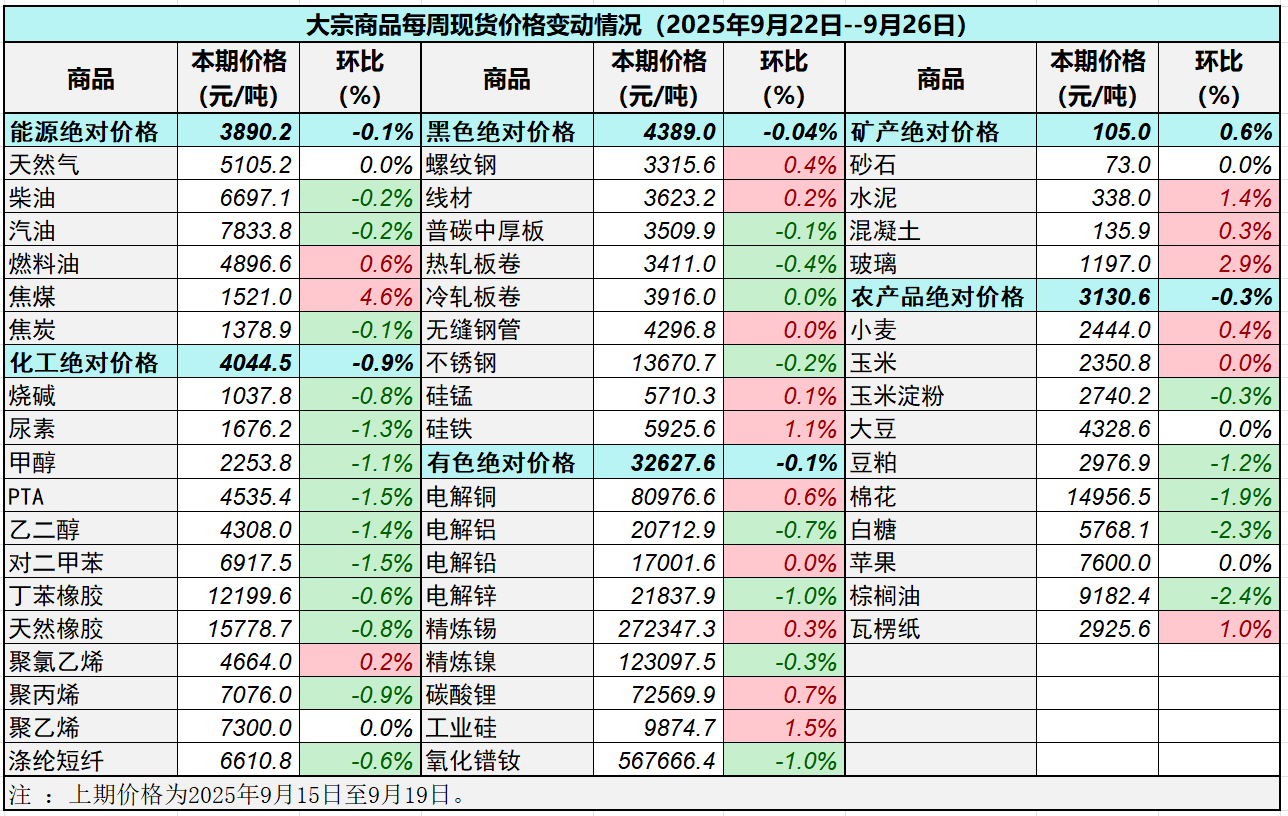 據中國物流與采購聯合會對全國50種重要大宗商品市場價格調查顯示,本期價格(2025年9月22日至9月26日)與上期價格相比,19種(占比38%)大宗商品價格上漲, 26種(占比52%)價格下跌, 5種(占比10%)價格持平。