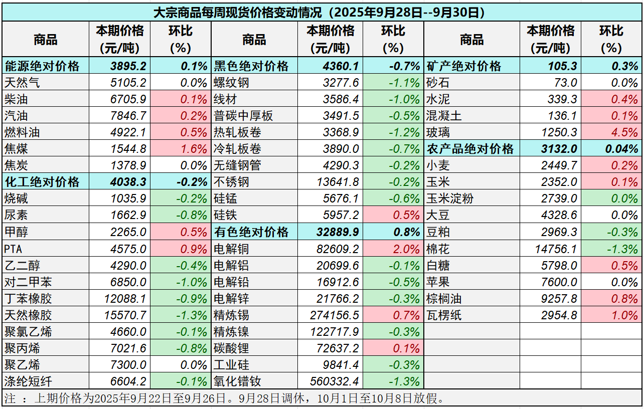 本表所示大宗商品價(jià)格(類別與產(chǎn)品規(guī)格說(shuō)明見(jiàn)附表)為以人民幣計(jì)價(jià)的現(xiàn)貨價(jià)格(包含流通費(fèi)用、利潤(rùn)和稅費(fèi)等)。計(jì)算這些價(jià)格時(shí)使用的信息來(lái)源,主要包括國(guó)內(nèi)重點(diǎn)地區(qū)的生產(chǎn)商、貿(mào)易商及下游消費(fèi)企業(yè)之間的成交、詢報(bào)盤及可成交價(jià)格。價(jià)格單位為人民幣元/噸。
