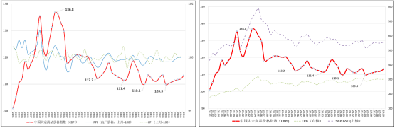 從國內外指數比較看:CBPI與上月PPI、CPI走勢有所分化。9月PPI環比由持平;其中,生產資料價格環比持平,生活資料價格環比下降0.2%。9月CPI環比上漲0.1%;其中,食品價格環比上漲0.7%、非食品價格環比下降0.1%。CBPI與S&P GSCI指數、CRB指數走勢一致,均小幅上漲。10月中美吉隆坡談判釋放積極信號,美聯儲年內再度降息25個基點,提振全球大宗商品市場信心;同時美歐加大對俄制裁,印尼銅礦事故、冰島鋁冶煉廠事故,亦對國際原油、有色金屬價格形成支撐。