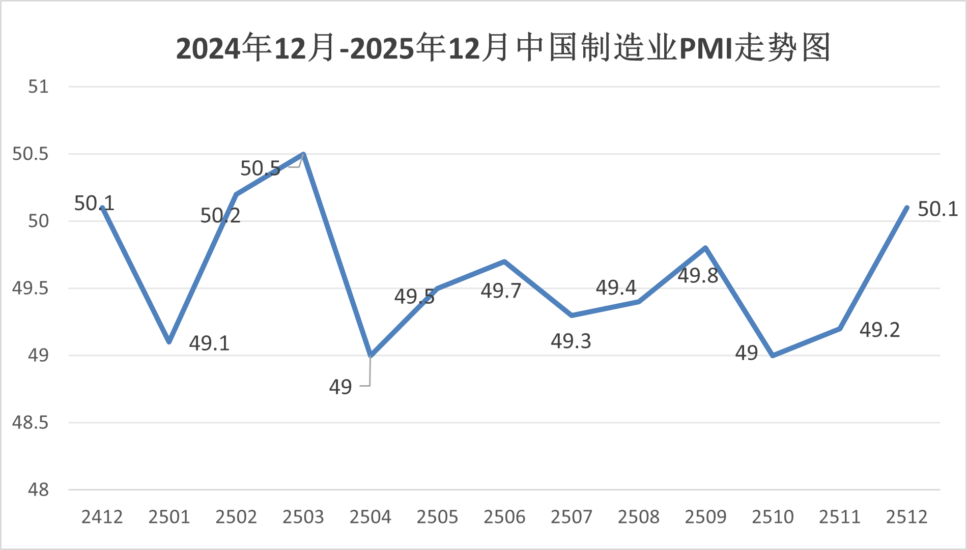 國家統計局服務業調查中心、中國物流與采購聯合會發布的2025年12月份中國制造業采購經理指數(PMI)為50.1%,比上月上升0.9個百分點。