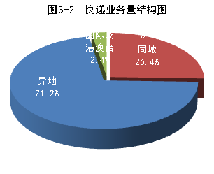 1-2月份,同城、異地、國際及港澳臺快遞業(yè)務(wù)收入分別占全部快遞收入的13.5%、56.7%和14.7%;業(yè)務(wù)量分別占全部快遞業(yè)務(wù)量的26.4%、71.2%和2.4%。與去年同期相比,同城快遞業(yè)務(wù)收入的比重上升1.5個百分點,異地快遞業(yè)務(wù)收入的比重上升1.5個百分點,國際及港澳臺業(yè)務(wù)收入的比重下降了1.8個百分點。