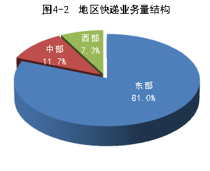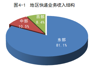 1-2月份,東、中、西部地區(qū)快遞業(yè)務(wù)收入的比重分別為81.1%、10.5%和8.4%,業(yè)務(wù)量比重分別為81%、11.7%和7.3%。與去年同期相比,東部地區(qū)快遞業(yè)務(wù)收入比重下降了1.8個百分點,快遞業(yè)務(wù)量比重下降了0.1個百分點;中部地區(qū)快遞業(yè)務(wù)收入比重上升了1.1個百分點,快遞業(yè)務(wù)量比重上升了0.6個百分點;西部地區(qū)快遞業(yè)務(wù)收入比重上升了0.7個百分點,快遞業(yè)務(wù)量比重下降了0.5個百分點。