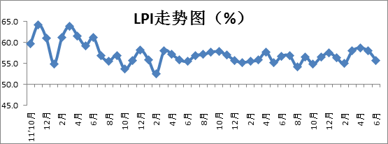 中國(guó)物流與采購聯(lián)合會(huì)發(fā)布的2015年6月份中國(guó)物流業(yè)景氣指數(shù)(LPI)為55.7%,比上月回落2.3個(gè)百分點(diǎn)。各分項(xiàng)指數(shù)中, 業(yè)務(wù)總量指數(shù)、新訂單指數(shù)、庫存周轉(zhuǎn)次數(shù)指數(shù)、設(shè)備利用率指數(shù)、固定資產(chǎn)投資完成額指數(shù)、從業(yè)人員指數(shù)和業(yè)務(wù)活動(dòng)預(yù)期指數(shù)回落;平均庫存量指數(shù)、資金周轉(zhuǎn)率指數(shù)、物流服務(wù)價(jià)格指數(shù)、主營(yíng)業(yè)務(wù)利潤(rùn)指數(shù)和主營(yíng)業(yè)務(wù)成本指數(shù)回升。
