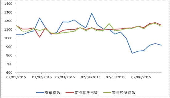從分車型指數看,各車型指數環比均有小幅回落。整車指數為919.2點,比上周回落2.0%,比年初下降10.4%,但較5月末回升11.5%;零擔輕貨為1139.4點,比上周回落2.8%,比年初回升3.0%,較5月末回升2.3%;零擔重貨為1153.1點,比上周回落2.3%,比年初回升3.8%,較5月末回升3.0%。