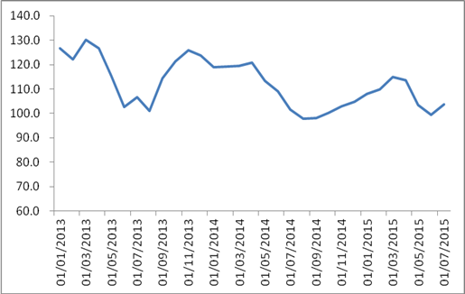 由中國物流與采購聯合會和廣東林安物流集團聯合調查的中國公路物流運價指數2015年7月為103.8點,比上月回升4.4%,比年初下降1.0%,比去年同期回升2.2%,總體上較年內低點5月仍有有所回升。