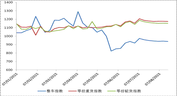 從分車型指數看,整車、零擔指數環比均有所回落。整車指數為937.2點,比上周回落0.49%,比年初回落8.6%;零擔輕貨指數為1151.6點,比上周回落0.2%,比年初回升4.1%;零擔重貨指數為1173.6點,比上周回落0.29%,比年初回升5.7%。