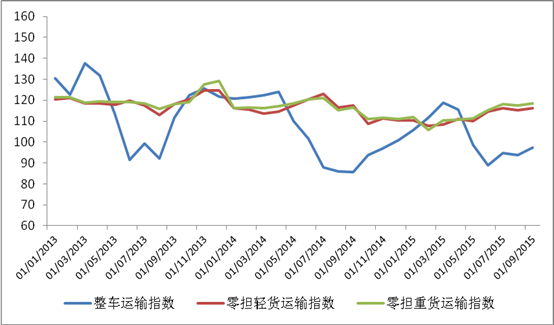 由中國物流與采購聯合會和廣東林安物流集團聯合調查的中國公路物流運價指數2015年9月為105.3點,比上月回升2.4%,比年初回升0.4%,比去年同期回升7.4%。