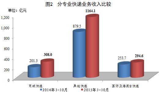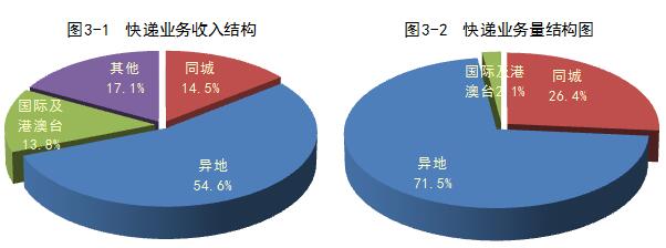 1-10月,同城、異地、國際及港澳臺快遞業(yè)務收入分別占全部快遞收入的14.5%、54.6%和13.8%;業(yè)務量分別占全部快遞業(yè)務量的26.4%、71.5%和2.1%。與去年同期相比,同城快遞業(yè)務收入的比重上升1.8個百分點,異地快遞業(yè)務收入的比重下降0.6個百分點,國際及港澳臺業(yè)務收入的比重下降了2.1個百分點。