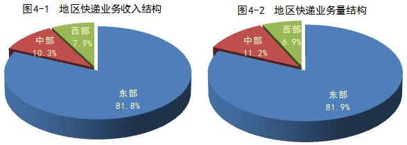 1-10月,東、中、西部地區(qū)快遞業(yè)務收入的比重分別為81.8%、10.3%和7.9%,業(yè)務量比重分別為81.9%、11.2%和6.9%。與去年同期相比,東部地區(qū)快遞業(yè)務收入比重下降了1.1個百分點,快遞業(yè)務量比重持平;中部地區(qū)快遞業(yè)務收入比重上升了0.9個百分點,快遞業(yè)務量比重上升了0.5個百分點;西部地區(qū)快遞業(yè)務收入比重上升了0.2個百分點,快遞業(yè)務量比重下降了0.5個百分點。