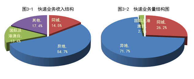 1-11月,同城、異地、國際及港澳臺快遞業務收入分別占全部快遞收入的14.5%、54.7%和13.4%;業務量分別占全部快遞業務量的26.2%、71.7%和2.1%。與去年同期相比,同城快遞業務收入的比重上升1.6個百分點,異地快遞業務收入的比重下降0.6個百分點,國際及港澳臺業務收入的比重下降了2.2個百分點。