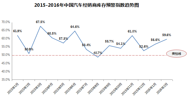 中國汽車流通協會發布的“中國汽車經銷商庫存預警指數調查”VIA(Vehicle Inventory Alert Index)顯示,2016年2月庫存預警指數為59.6%,比上月上升了3.0個百分點。庫存預警指數處于警戒線以上。
