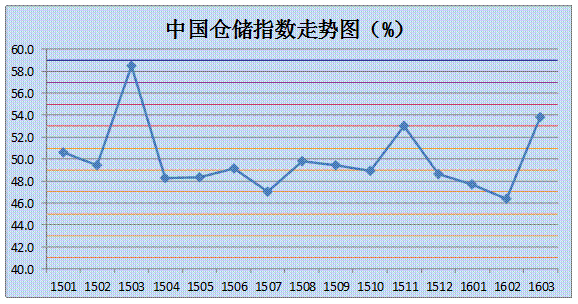 中國物流與采購聯合會與中儲發展股份有限公司聯合調查的2016年3月中國倉儲指數為53.8%,較上月大幅回升7.4個百分點。各分項指數中,收費價格指數、期末庫存指數及業務活動預期指數出現回落,其余指數均有不同程度的回升。