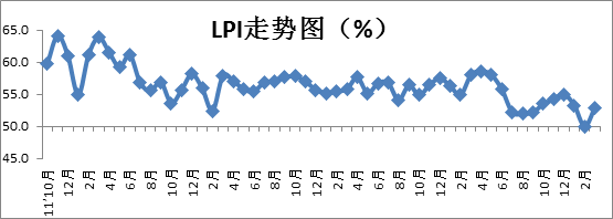 成本和利潤指數回升,企業經營情況有所改善。3月份,主營業務利潤指數為回升至50.7%,顯示出企業經營情況有所改善,但比業務活動指數低2.2個百分點,比主營業務成本指數低7.3個百分點,顯示出物流企業利潤回升主要源于業務規模的增加,依靠規模擴張獲取增量收益的“高成本、低效益”粗放型經營模式沒有改變,物流企業轉型升級壓力依然較大。