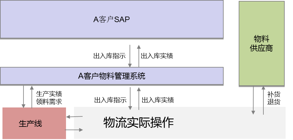 在我們服務的案例中,客戶使用的是SAP系統進行企業資源管理,出于對企業內部信息安全的考慮,采用了硬隔離的方法,對外不開辟任何對接端口。為了解決生產制造過程的物料管理問題,單獨開發了一套“物料管理系統”用于生產與物流的訂單管理與物料管理,但不具備倉儲管理能力。