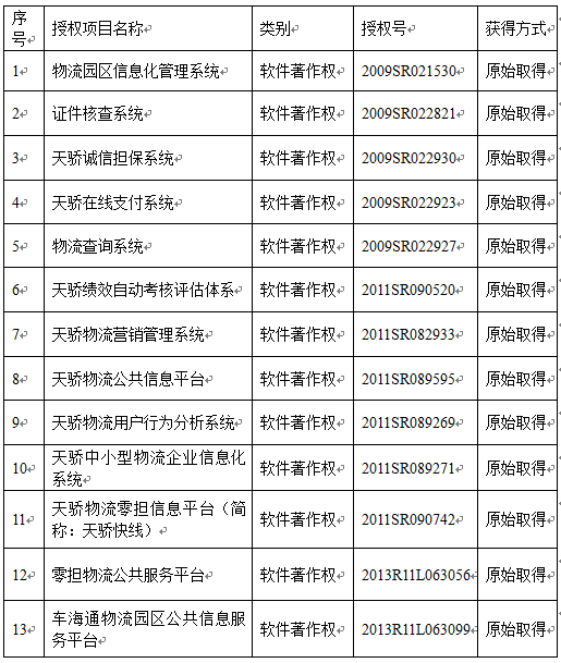 通過(guò)公司研發(fā)團(tuán)隊(duì)的共同努力和刻苦公關(guān),公司研發(fā)的《天驕快車(chē)》、《牛運(yùn)網(wǎng)》、《天驕動(dòng)車(chē)》、《車(chē)車(chē)網(wǎng)》、《園區(qū)信息化管理系統(tǒng)》、《物流查詢(xún)系統(tǒng)》、《中小型物流企業(yè)信息系統(tǒng)》、《誠(chéng)信擔(dān)保系統(tǒng)》等主要產(chǎn)品,受到了市場(chǎng)的高度認(rèn)可與廣泛應(yīng)用,市場(chǎng)占有率達(dá)到95%以上。目前,注冊(cè)企業(yè)用戶(hù)達(dá)23000多家,成為會(huì)員用戶(hù)企業(yè)達(dá)到16870多家。相關(guān)產(chǎn)品獲得軟件著作權(quán)13項(xiàng)。