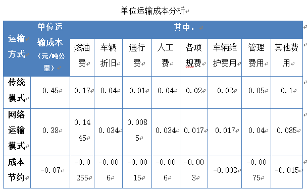 運(yùn)輸成本對(duì)比分析指在完成相同周轉(zhuǎn)量下的單位運(yùn)輸成本進(jìn)行對(duì)比分析,包括總的成本和各項(xiàng)成本費(fèi)用結(jié)構(gòu)(燃油、車輛折舊、保險(xiǎn)等)對(duì)比。