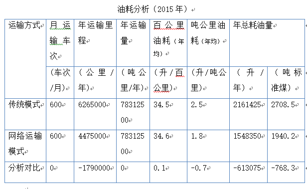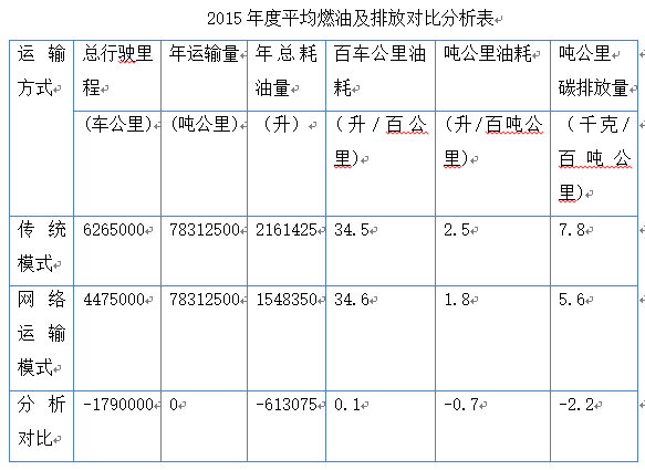 數(shù)據(jù)分析可得擬投入零擔(dān)危險(xiǎn)品網(wǎng)絡(luò)化運(yùn)輸項(xiàng)目后,在完成同貨運(yùn)任務(wù)時(shí),油耗對(duì)比可達(dá)到:(1548350-2161425)/2161425*100%=-28.4%,即在信息系統(tǒng)的幫助下零擔(dān)危險(xiǎn)品網(wǎng)絡(luò)化運(yùn)輸項(xiàng)目比傳統(tǒng)運(yùn)輸節(jié)油28.4%,每年可節(jié)油0#柴油613075L,合計(jì)768.3噸標(biāo)準(zhǔn)煤。