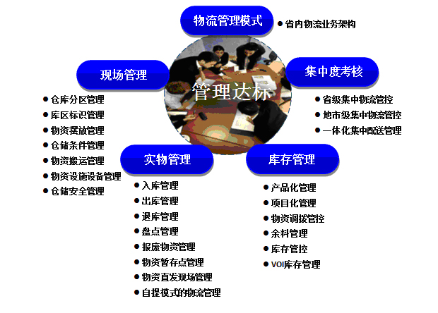 廣東移動從2012年開始根據集團管理要求,制定了《物流管理達標范圍和標準》,其中涉及省市公司的物流管理模式、集中度考核、庫存管理、實物管理及現場管理五大模板,共25個大項達標點、126個物流風險控制點,組織全省近2年的物流管理達標活動,通過各單位達標管理工作自查對比、制訂達標計劃及省公司統一驗收檢查等環節,形成省、市公司統一的物流生產運營業務標準,全省從原來管理達標率為84%提升到100%達標。物流管理達標主要業務內容見圖1:
