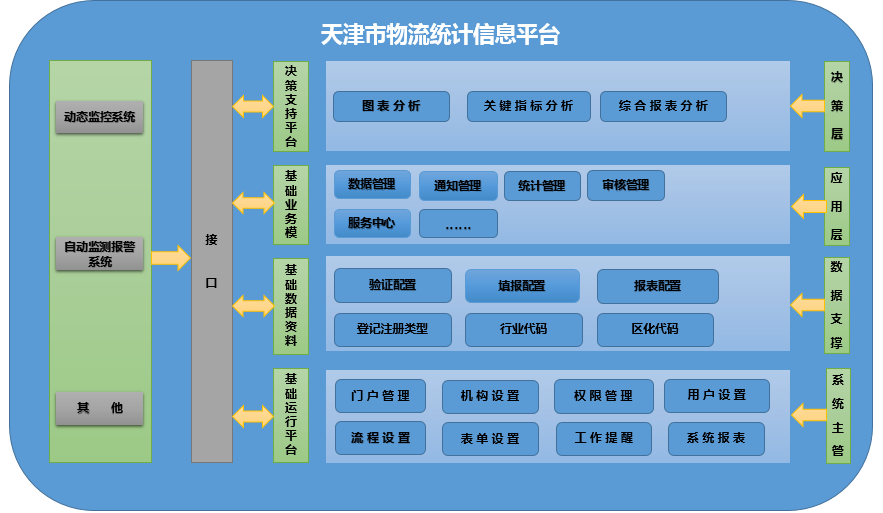 《物流企業經營統計信息平臺》的首要任務是反應天津市物流企業活動的規模、結構、效益和發展變化情況,為政府相關部門制定物流業發展政策及規劃、進行宏觀管理提供科學依據,為國民經濟提供基礎數據支持。
