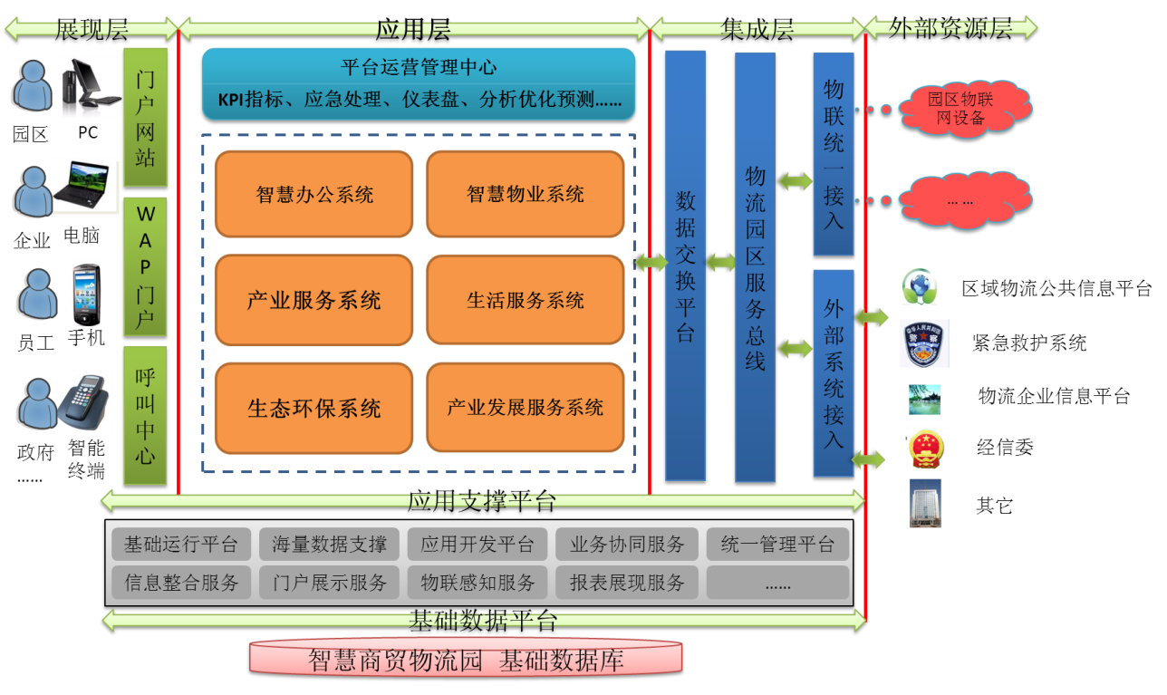 化物流園區(qū)應(yīng)用與服務(wù)主要有智慧辦公系統(tǒng)、智慧物業(yè)系統(tǒng)、產(chǎn)業(yè)服務(wù)系統(tǒng)、生活服務(wù)系統(tǒng)、生態(tài)環(huán)保系統(tǒng)、產(chǎn)業(yè)發(fā)展服務(wù)系統(tǒng)等。