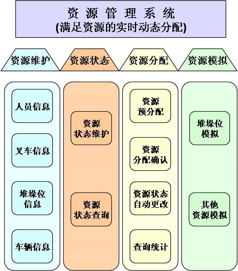 資源管理子系統(tǒng)主要是針對(duì)物流園區(qū)內(nèi)的資源,包括人員、部分資產(chǎn)(叉車、車輛、堆垛位等)以及掛靠或租賃來(lái)的資源進(jìn)行管理的系統(tǒng),主要包括資源信息的維護(hù)、資源信息的模擬、資源信息狀態(tài)以及資源的動(dòng)態(tài)分配。資源管理系統(tǒng)主要是通過(guò)資源狀態(tài)進(jìn)行資源動(dòng)態(tài)、合理的分配,達(dá)到資源的高利用率,從而提高園區(qū)資源分配的智能化水平。