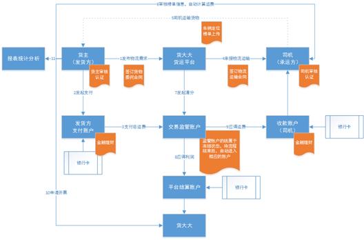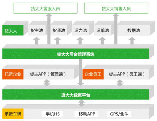 在基于無車承運人的貨主和司機精細化管理的基礎上,貨大大為司機和貨主提供了運輸業(yè)務一站式服務,逐步建立和完善基于平臺的生態(tài)體系,如下圖所示。