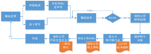 貨達物流與太平洋保險以及華泰保險實現(xiàn)了后臺借口打通,可以為所承運的貨物進行實時投保,為事故車輛提供7*24小時專業(yè)理賠服務,保險公司確認事故現(xiàn)場后24小時內(nèi)急速賠付,流程如下圖所示。