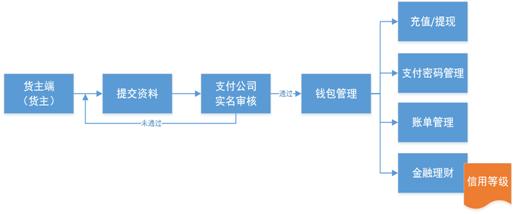 包含賬戶認證、充值、支付、提現(xiàn)、支付密碼管理、賬單管理、金融理財?shù)裙δ?,全方位保護貨主的資金安全,并且為其提供現(xiàn)金貸等產(chǎn)品,平臺依據(jù)大數(shù)據(jù)(貨主的發(fā)貨記錄、支付記錄、錢包記錄、誠信體系評分),自動生成用戶畫像,建立用戶信用等級,給予20萬-100萬不等的金融貸款,幫助貨主解決短期資金周轉(zhuǎn)不開的痛點。流程圖如下所示: