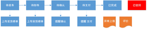 司機在線接單生成進行中運單記錄,貨主可實時查看、管理進行中、已取消、已完成運單,運單狀態(tài)共分為四個:待裝車---待卸車---待確認---已完成;